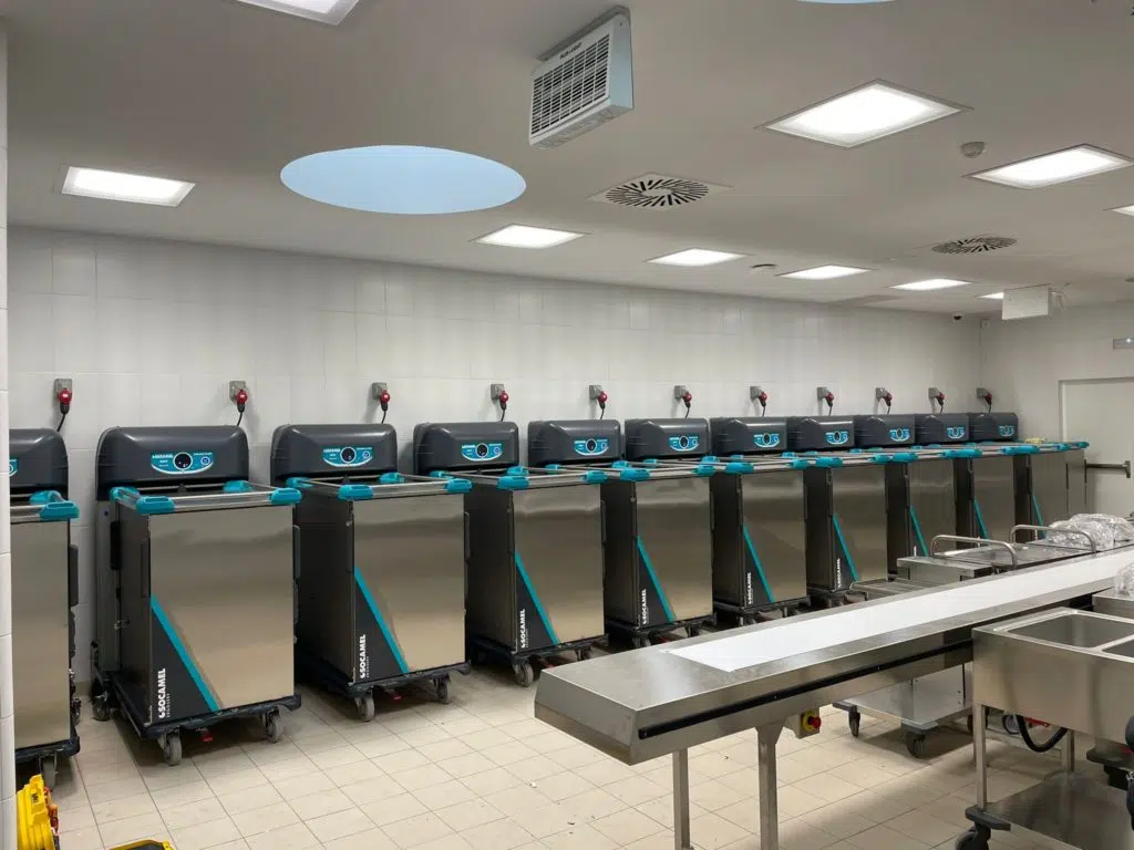 Début 2022, l’hôpital de Rostock s’est offert un nouveau système logistique de distribution de repas sur plateaux. Alors que leur service nécessitait auparavant 180 chariots froids et 110 chariots chauds, ce sont désormais 210 navettes et 70 bornes qui se chargent de la remise en température des repas. Une belle installation pour Socamel !