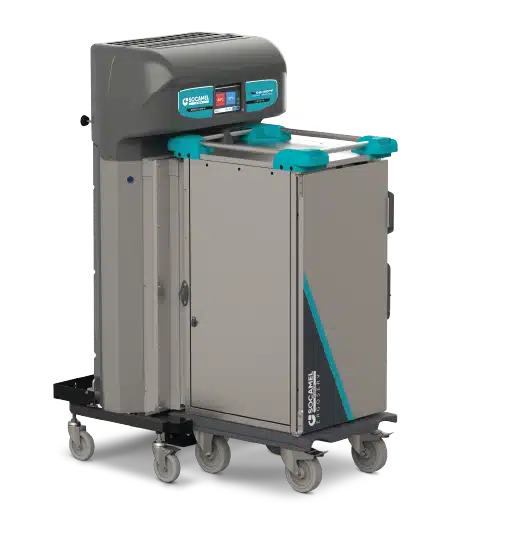 Un système Borne/Navette de taille réduite qui assure la liaison entre les cuisines et les unités à desservir. Une solution parfaite pour optimiser l’espace sur toute la phase de logistique de distribution des repas : transport camion, stockage des équipements, distribution des repas.